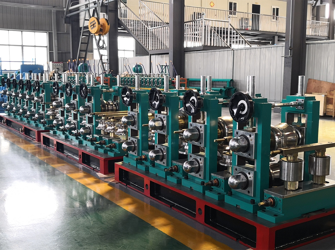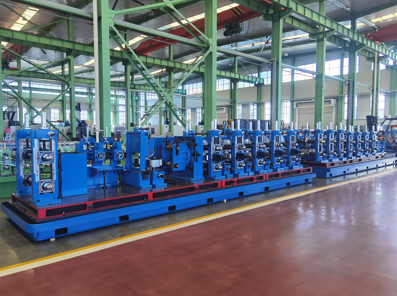 Este sistema pode ser usado para produzir tubos redondos e quadrados de diferentes tamanhos em uma linha de tubos através da nossa 'tecnologia de troca rápida de rolo'.